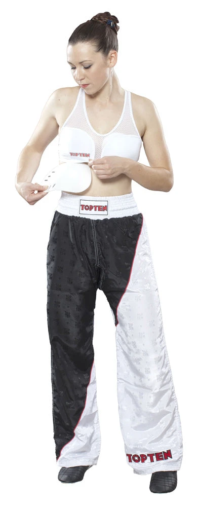 In martial arts, girls and women should wear a suitable chest protector to protect the chest. With the “Cool Guard” by TOP TEN you get a top fashionable sports bra, which can be pimped on the modular system with cups. The main component of the “Cool Guard” is breathable mesh. Thus, TOP TEN ensures super comfortable, lightweight and skin-friendly wearing comfort. The wide straps of the top run in the back to the X and give even a large bust in sports the necessary support. The elastic finish is supple under the chest area and prevents slippage during dynamic movements. A quick change from fitness to contact sports is possible with the simple insertion of the protective shells at any time and without any problems.