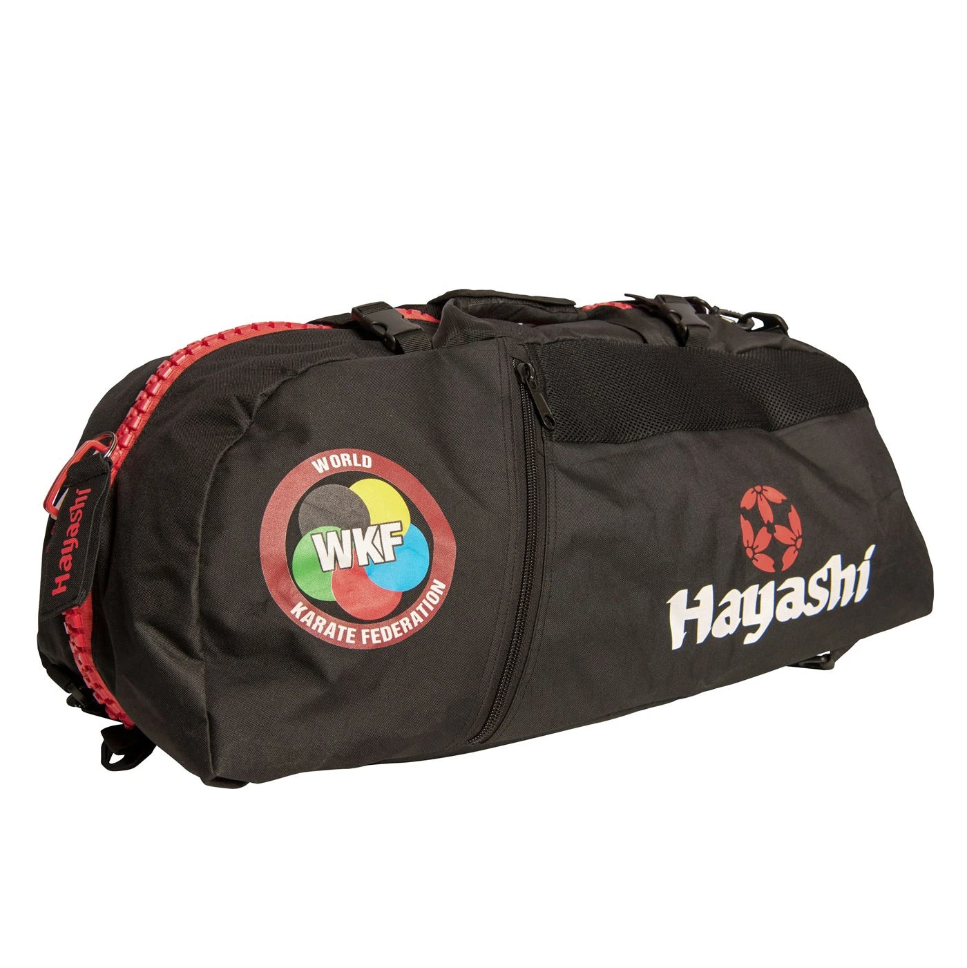 Innovative and practical in its dual function, both backpack that gym bag, label HAYASHI WKF printed. Double shoulder cushion on the bottom.